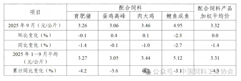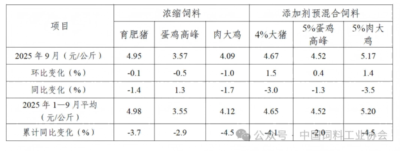 表3 2025年9月饲料企业浓缩饲料和添加剂预混合饲料平均价格