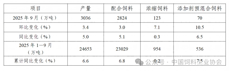2025年9月,全国工业饲料产量3036万吨,环比增长3.4%,同比增长5.0%。其中,配合饲料、浓缩饲料、添加剂预混合饲料同比分别增长5.1%、0.3%、6.5%。主要饲料产品出厂价格同比下降,畜禽配合饲料、添加剂预混合饲料出厂价格环比以增为主,浓缩饲料出厂价格环比小幅下降。饲料企业生产的配合饲料中玉米用量占比为33.6%,同比下降2.4个百分点;配合饲料和浓缩饲料中豆粕用量占比为14.3%。