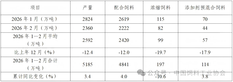 表1 2026年1—2月全国工业饲料生产情况