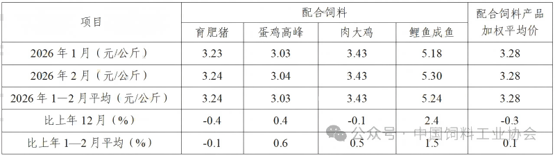 表2 2026年1—2月饲料企业配合饲料平均价格