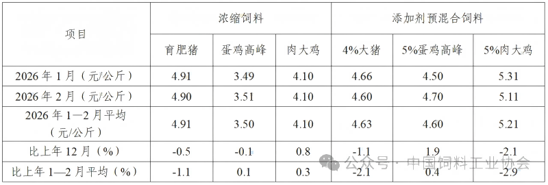 表3 2026年1—2月饲料企业浓缩饲料和添加剂预混合饲料平均价格