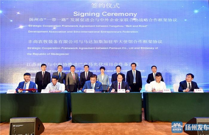 据悉,6月17日,中国对外投资合作洽谈会扬州分会暨扬州市“一带一路”合作项目推进会隆重举行。上海合作组织秘书长诺罗夫、马达加斯加共和国驻华大使罗班松·让·路易、扬州市委副书记、市长张宝娟、省发改委副主任王显东、中国产业海外发展协会秘书长和振伟出席会议并致辞。巴林王国经济发展委员会驻华代表蒋赟,市委常委、常务副市长陈锴竑,市政府秘书长尤在晶参加活动。本次活动期间,签署了《丰尚农牧装备有限公司与马达加斯加园区合作框架协议》等合作成果。