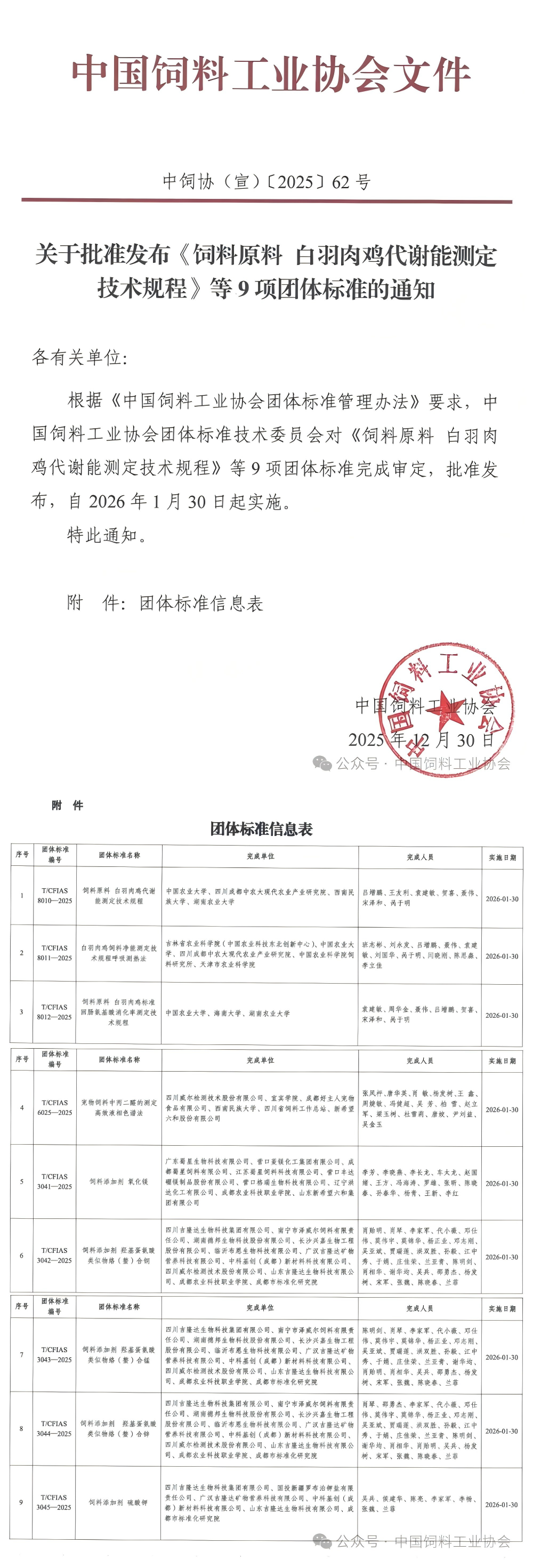 关于批准发布《饲料原料 白羽肉鸡代谢能测定技术规程》等9项团体标准的通知