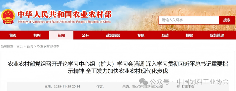 11月28日,农业农村部党组召开理论学习中心组(扩大)学习会,部党组书记、部长韩俊主持会议并讲话。会议强调,要深入学习贯彻党的二十届四中全会精神和《习近平谈治国理政》第五卷,深刻领会习近平总书记关于农业农村现代化的重要讲话和重要指示精神,研究谋划“十五五”时期推进农业农村现代化的思路举措,扎实抓好各项战略任务和重大举措落实,以加快农业农村现代化更好推进中国式现代化建设。中国社会科学院学部委员魏后凯作专题辅导报告。